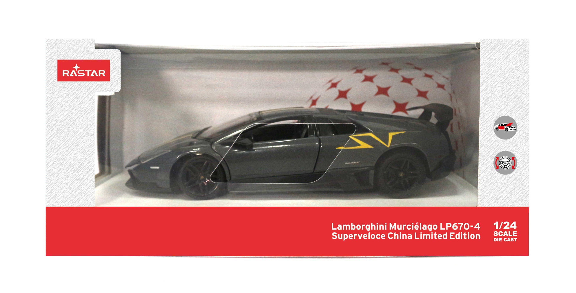 Masinuta are proportiile ideale pentru momente pline de distractie si amuzament, avand dimensiunile in centimetri dupa cum urmeaza : 19.6*9.3*5. Masinuta metalica Lamborghini Murcielago, scara 1 la 24, are anvelope de cauciuc si un design detaliat, interior-exterior, realizat din materiale metalice turnate cu accesorii realizate din material plastic de calitate superioara. Copilul dumneavoastra se poate juca in voie cu masina metalica Lamborghini Murcielago de la brandul international Rastar. Nicio cursa nu este imposibil de castigat cu acesta masinuta, care este o replica oficiala cu licenta a modelului original, construita cu mare atentie la detalii. Pasionatii si colectionarii de masini pot de asemenea aprecia aceasta macheta metalica.
